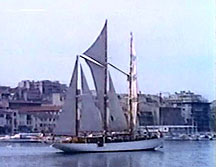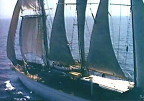 ![]() The Verona under sail on the Mediterranean. The person climbing the ratlines (look for the white dot against the leech of the forward staysail) is JT. |